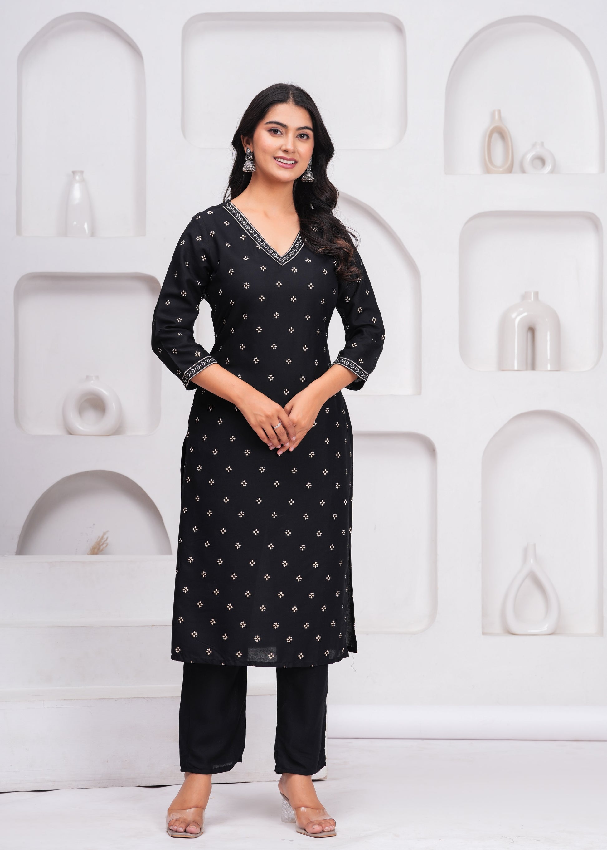 This black Kurta Set showcases an all-over delicate buta print, accentuated with embroidered detailing on the neckline and sleeves. Crafted for comfort and elegance, it’s perfect for everyday wear or semi-formal gatherings.