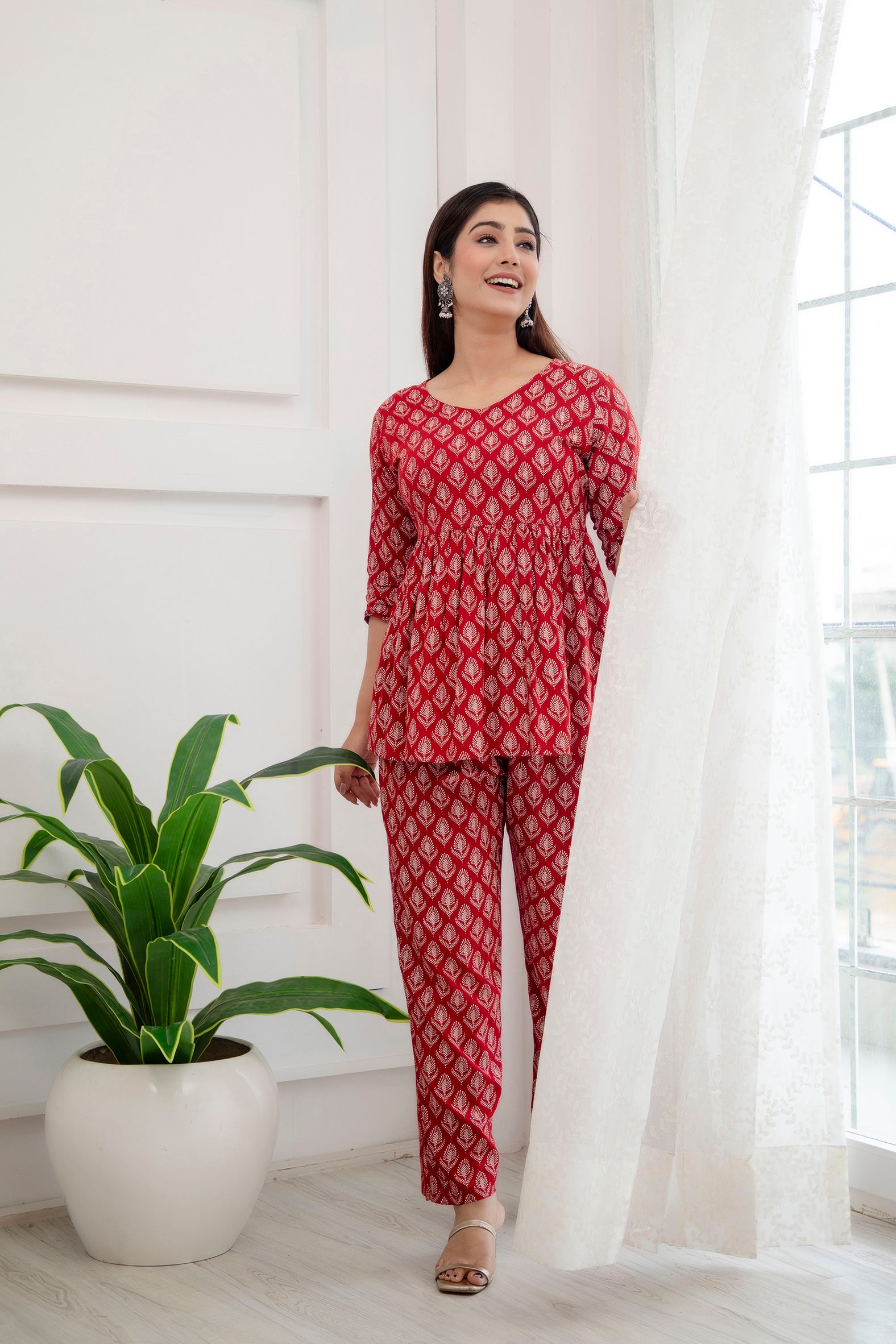 Elevate your everyday style with this vibrant red co-ord set, featuring a graceful all-over block-inspired leaf motif in a subtle white hue. The top boasts a soft V-neckline and three-quarter sleeves, paired with a flattering empire waistline that flares into a flowy peplum silhouette. The coordinated straight-leg pants offer a relaxed fit, combining comfort and sophistication effortlessly. Crafted from breathable, skin-friendly fabric, this ensemble is ideal for casual outings, festive get-togethers, or laid-back days when you still want to look put-together.