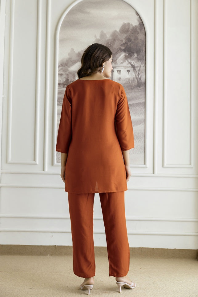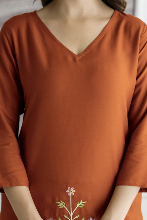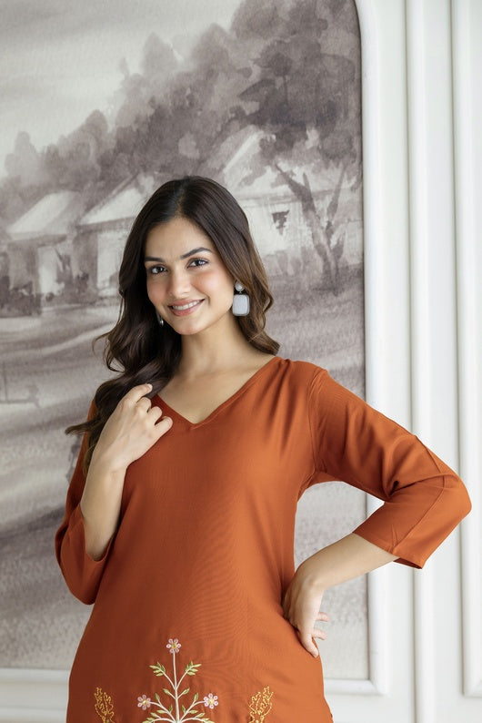 Add elegance to your ethnic wardrobe with this stylish rust orange rayon kurta pant co-ord set for women. Crafted from premium quality rayon fabric, this outfit offers a soft, breathable, and comfortable feel, making it perfect for all-day wear. The beautiful embroidered detailing on the kurta hem featuring artistic motifs adds a unique and graceful ethnic touch. Designed with a stylish V-neckline and 3/4 sleeves, this kurta pairs perfectly with matching straight-fit pants, creating a trendy coordinated outfit that is both modern and traditional. This women’s rayon cord set is perfect for casual outings, office wear, daily wear, college, festive gatherings, and travel, giving you a sophisticated and effortless look.