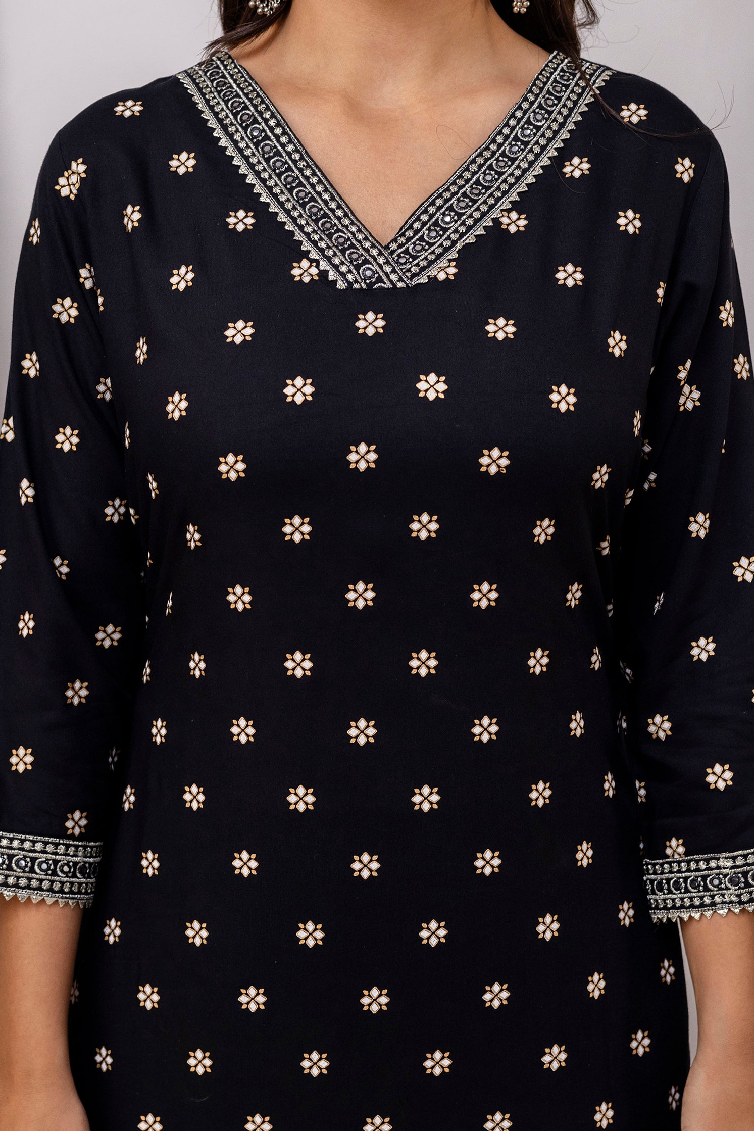 This elegant Black Rayon Kurta Pant With Dupatta Set features delicate white floral motifs printed all over. It is designed with a Embroidered V-neckline and three-quarter sleeves, both adorned with mirror work and embroidered detailing. Paired with matching pants, this Kurta Pant With Dupatta Set is perfect for festive and semi-formal occasions.