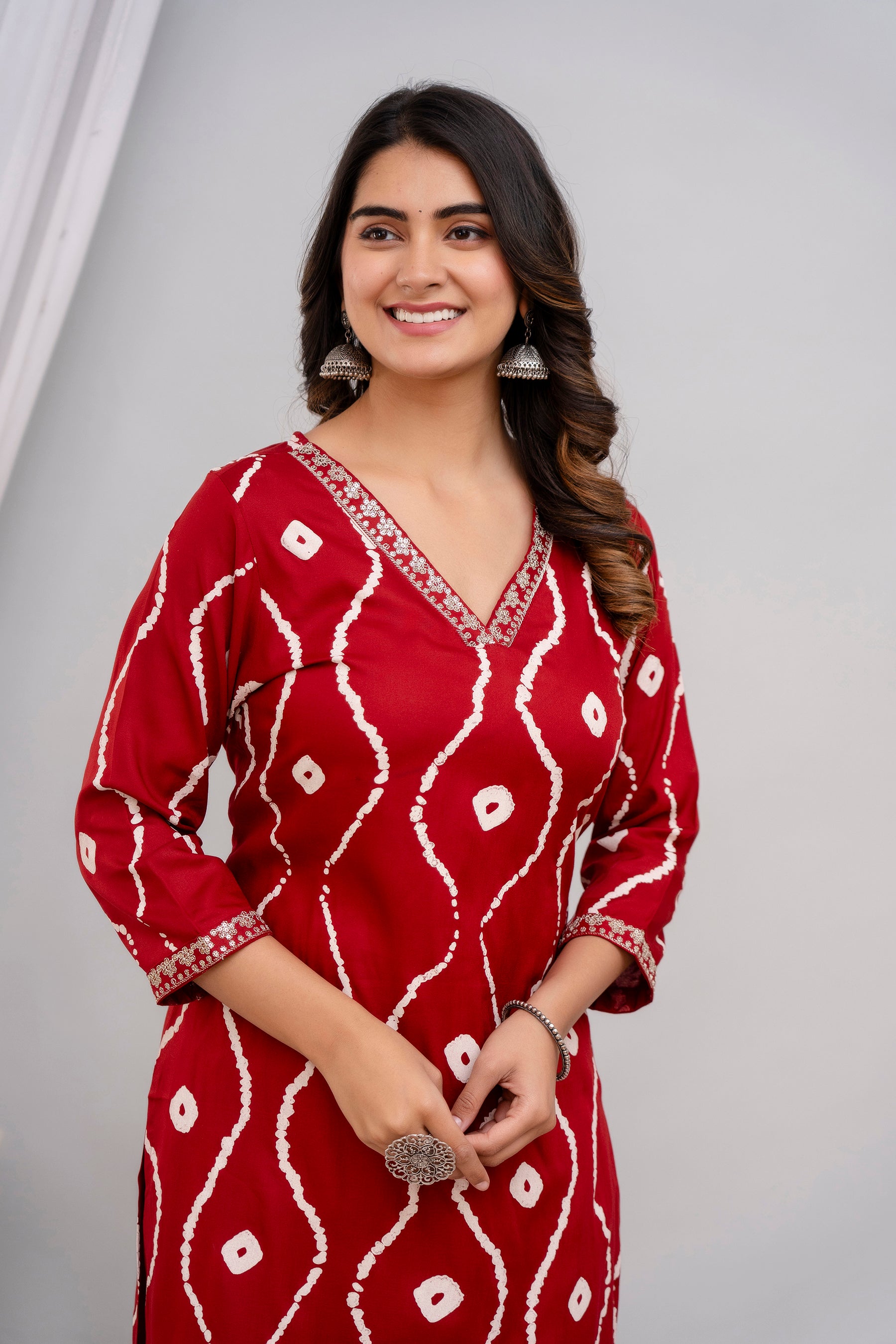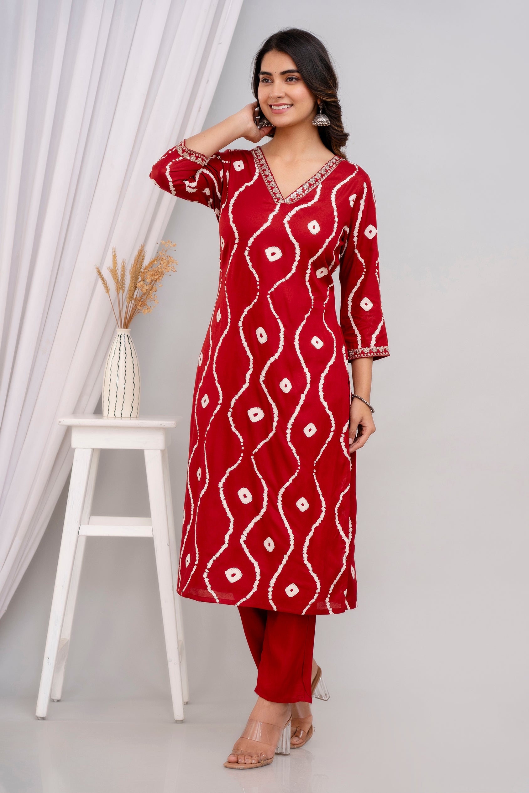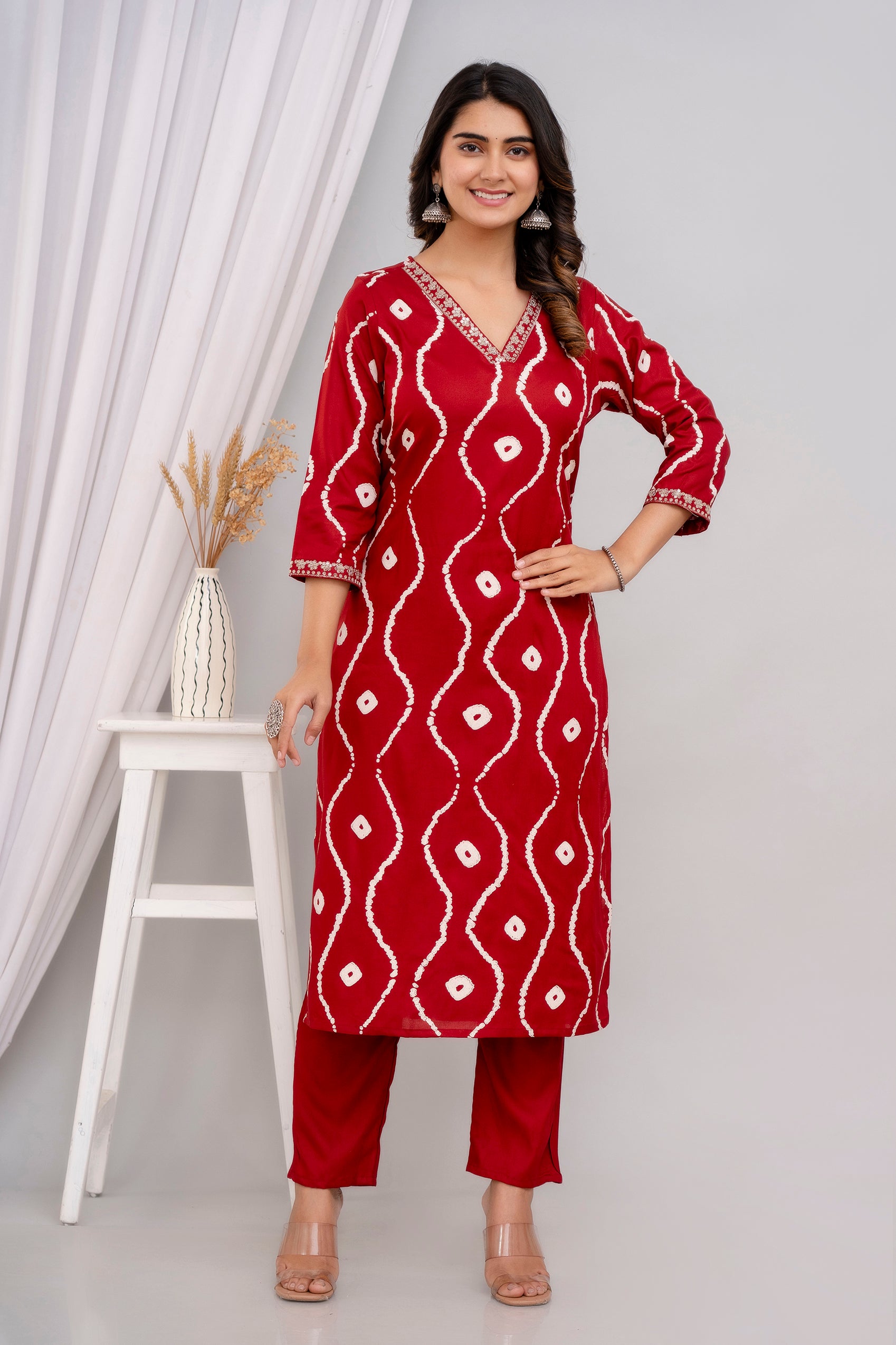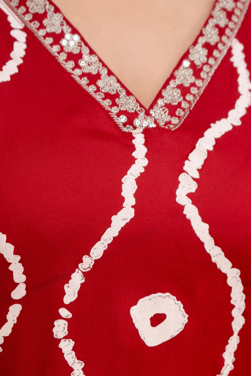 This elegant maroon cotton Kurta Set showcases a striking white tie-dye inspired pattern. Designed with a V-neckline featuring mirror work embellishments and three-quarter sleeves, it offers a straight fit and is paired with matching maroon pants. Perfect for casual gatherings or festive occasions.