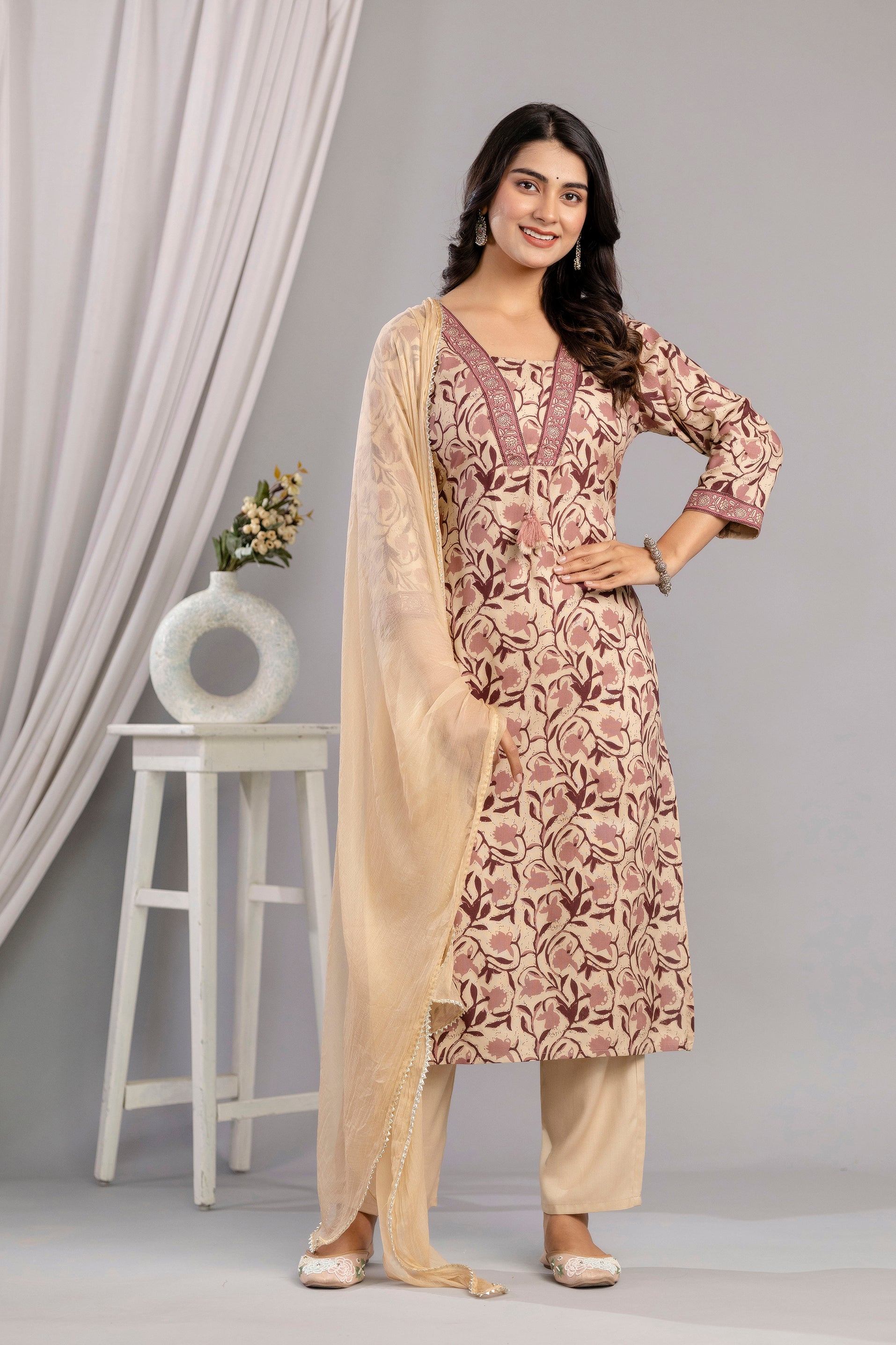 This beige Kurta Pant With Dupatta Set features an elegant wine floral print, enhanced with a richly embroidered V-neckline and matching sleeve borders. The soft, earthy tones and tassel detail add charm, making it a graceful choice for both casual and semi-formal occasions.